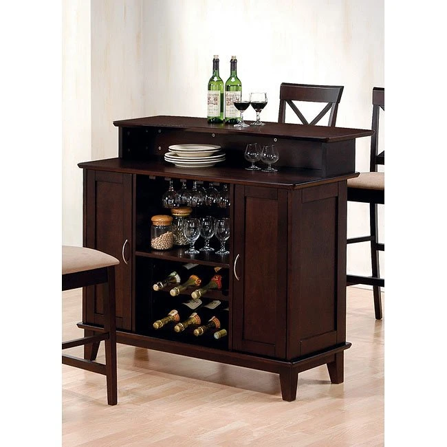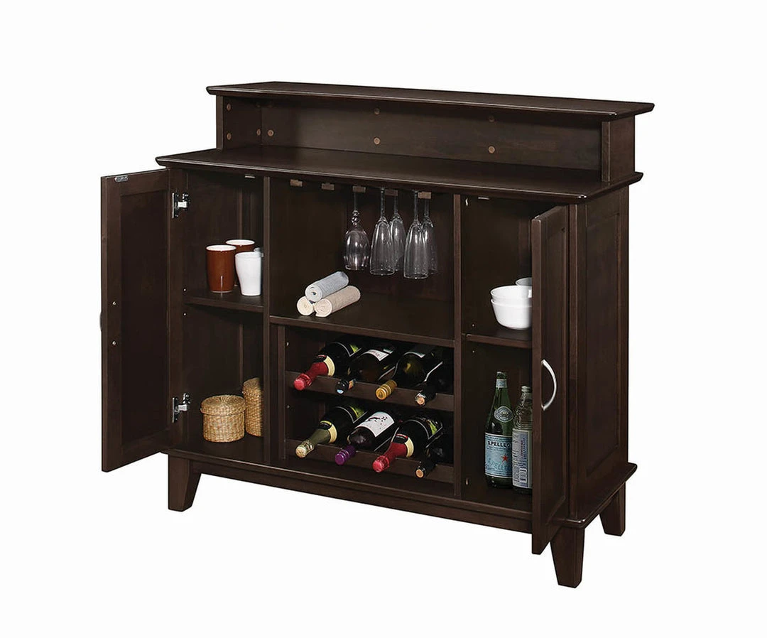 Show off your wine collection with this storage bar unit. Finished in a deep cappuccino with solid hardwoods and veneers. Clean lines create this transitional style, which is easy to match with any existing decor. Features include a wine bottle storage area with stemware rack and multiple storage compartments.