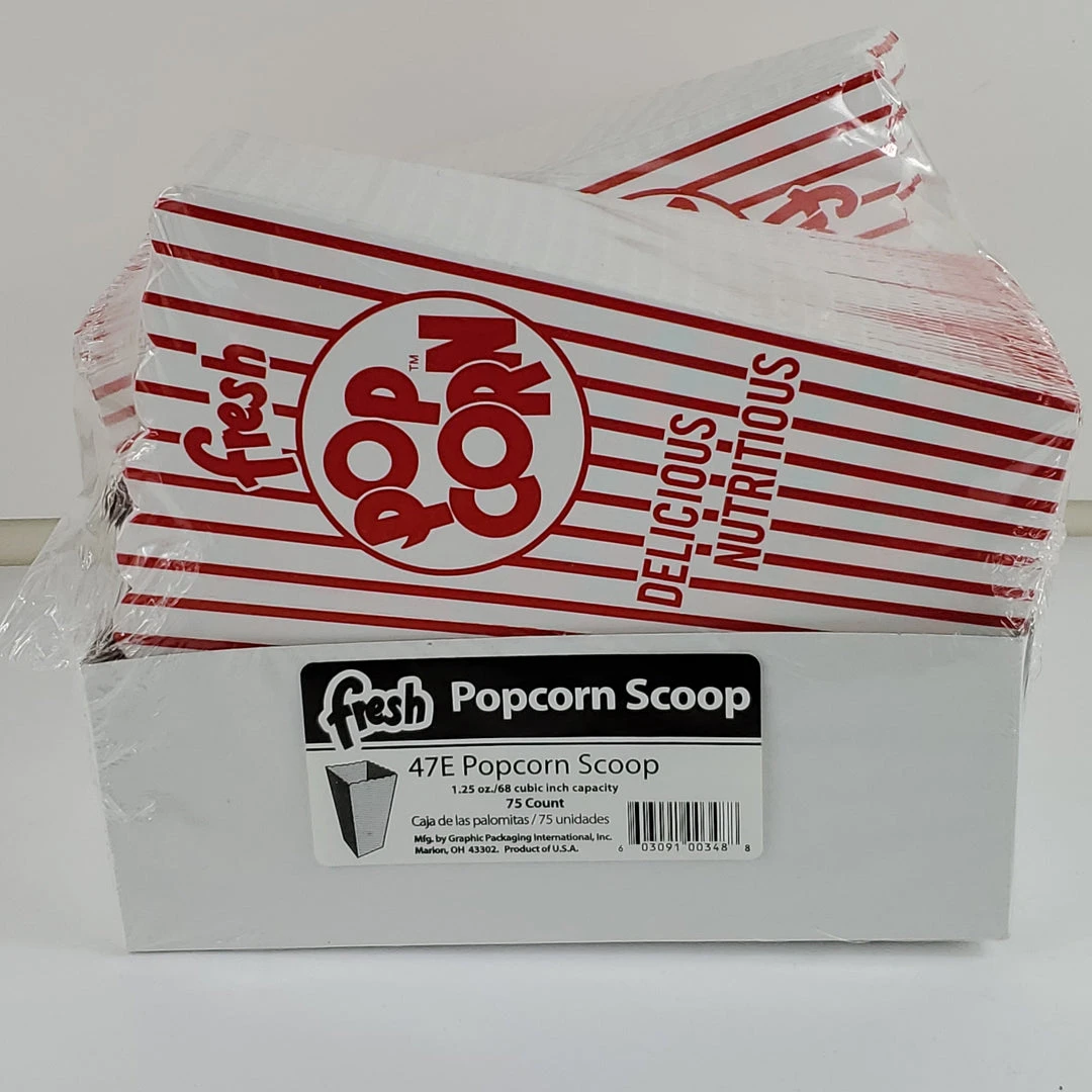 These popular red and white striped boxes are both festive and functional. Constructed of heavy gauge card stock, they’re sturdy enough to scoop popcorn straight from the popper and then stand on their own for easy enjoyment. 75 Count