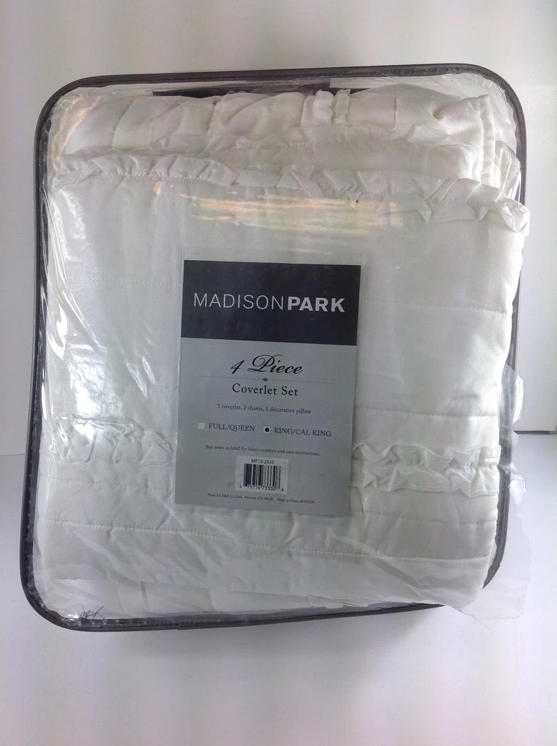 Celeste 4 Piece Reversible Coverlet Set King/Cal King (104″ x 94″) by Madison Park Create a shabby chic look in your bedroom with the Madison Park Celeste Collection. This solid reversible white coverlet has ruffles and quilting paired with a contrasting embroidered decorative pillow for a clean update for your space. Note:Â Has a small amount of dirt at corner of coverlet as shown in picture.