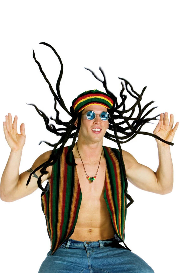 This Adult Rasta Costume comes complete with the headpiece with dreads, vest, necklace and sunglasses.