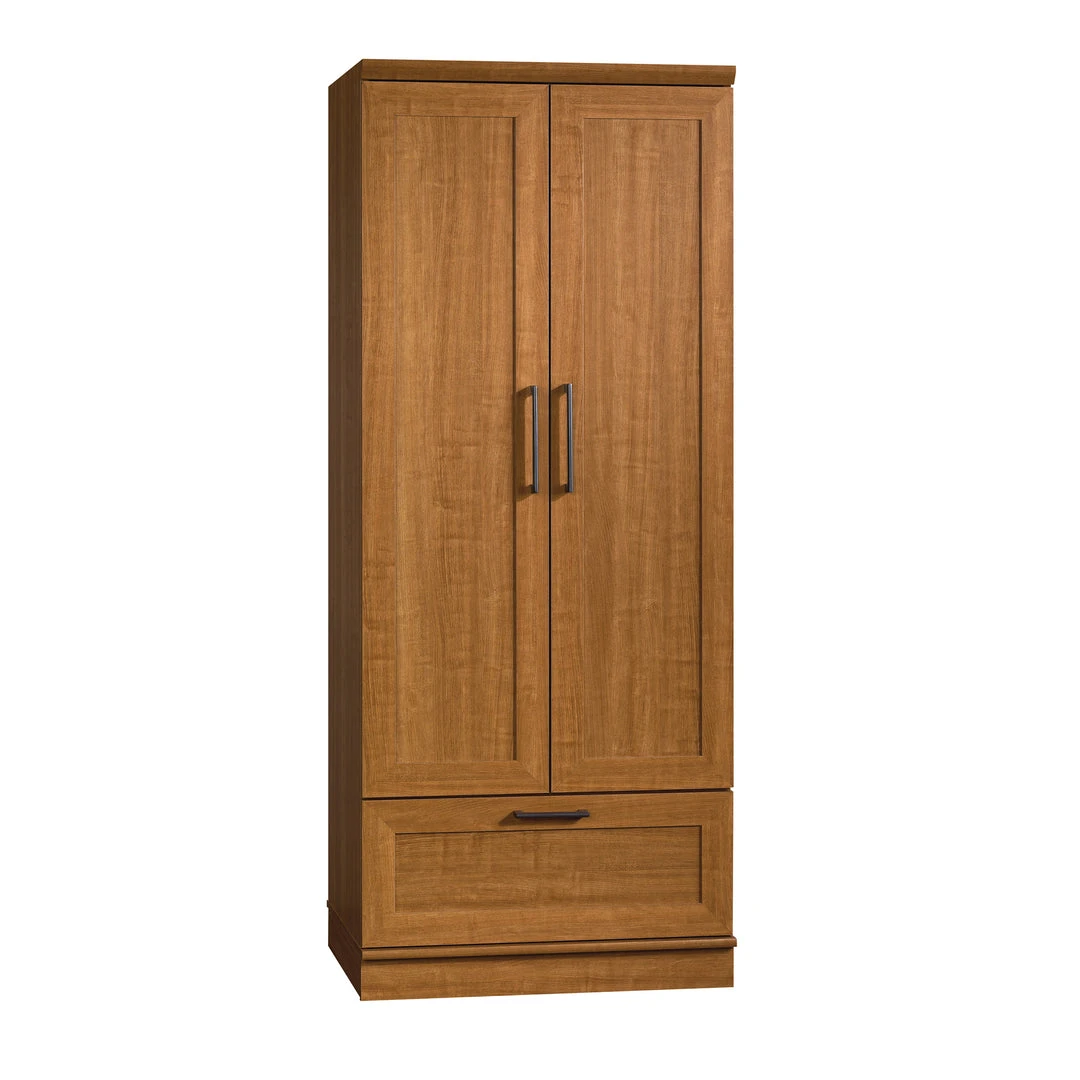 The perfect blend of style and functionality. This wardrobe/storage cabinet from the Sauder Select collection is just what your home has been looking for. Behind its two framed panel doors, it features a garment rod, an adjustable shelf and an easy gliding storage drawer. Other features include adjustable base levelers and an enclosed back panel with cord access. Finished in Sienna Oak, this handsome cabinet is the solution to all your storage woes. (email us for PICKUP)